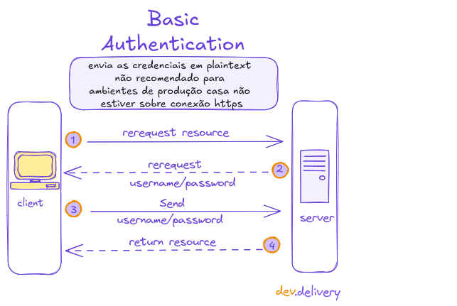 O cliente envia uma requisição com o header (Authorization) que contém a palavra Basic e o nome de usuário e senha, separados por dois pontos no formato de base64.