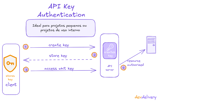 A ideia central do formato de API Keys é simples, o servidor gera uma chave de acesso única para o client, e para utilizar a API, o client envia essa chave única em toda requisição.
