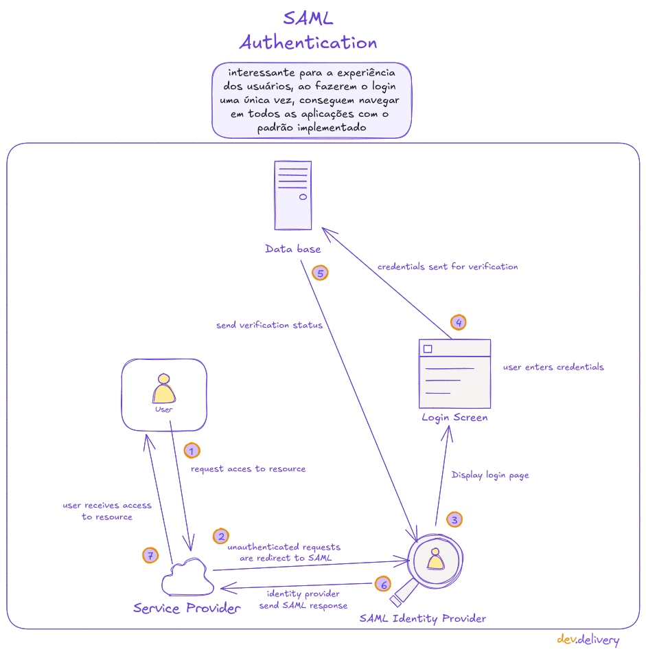 Na prática, o SAML ativa o Single Sign-On (SSO), algo bem interessante para a experiência dos usuários, ao fazerem o login uma única vez, conseguem navegar em todos as aplicações com o padrão implementado.